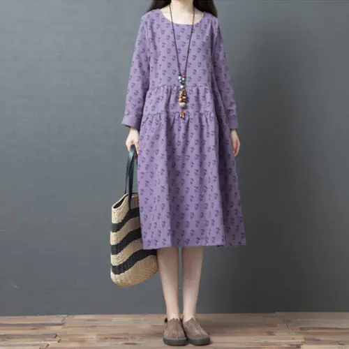 Loose stitching cotton and linen printed round neck dress